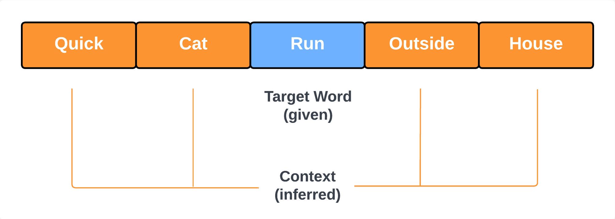 Consider the sentence: "A quick cat is running outside the house." If "Run" is our target word, Skip-Gram might predict context words like "Quick," "Cat," "Outside," and "House," depending on the window size.